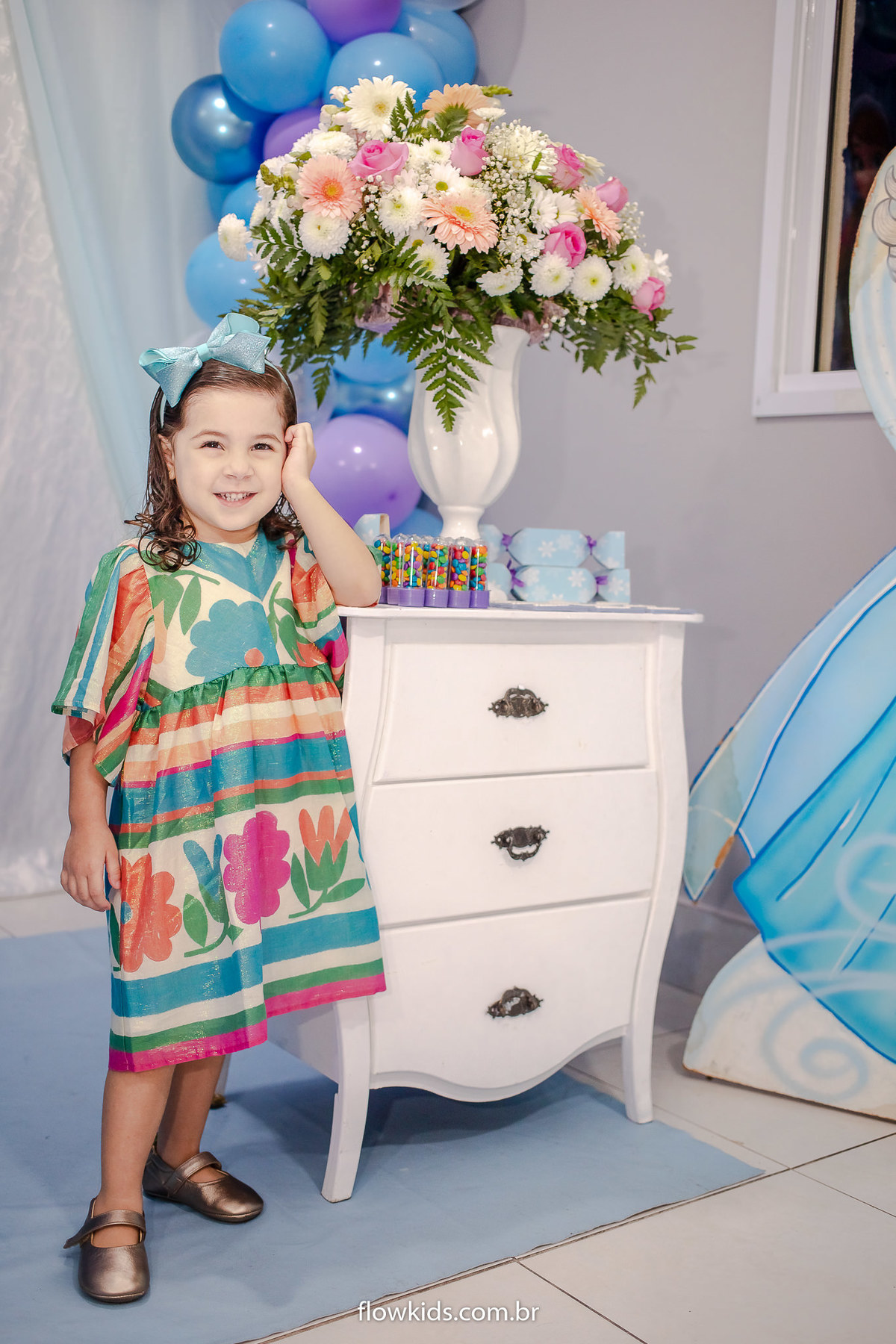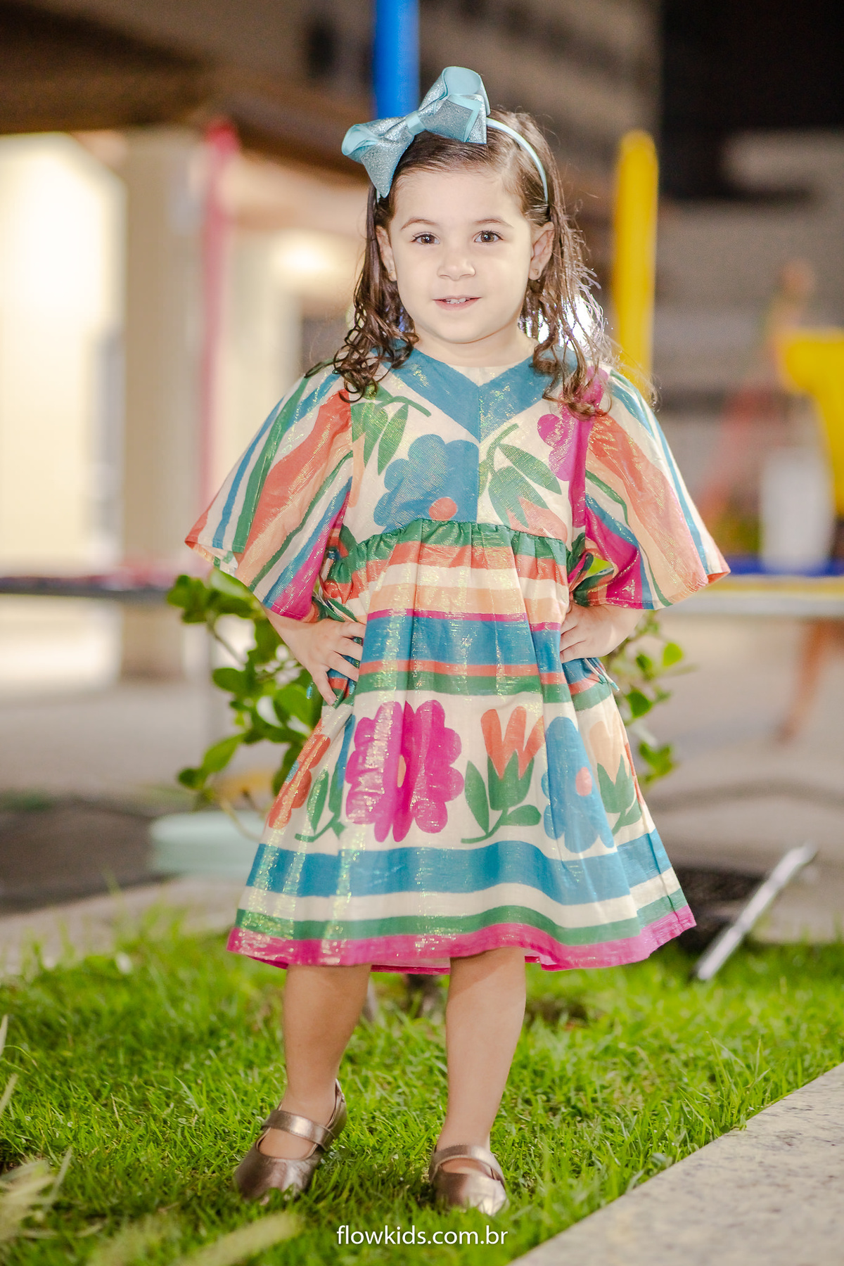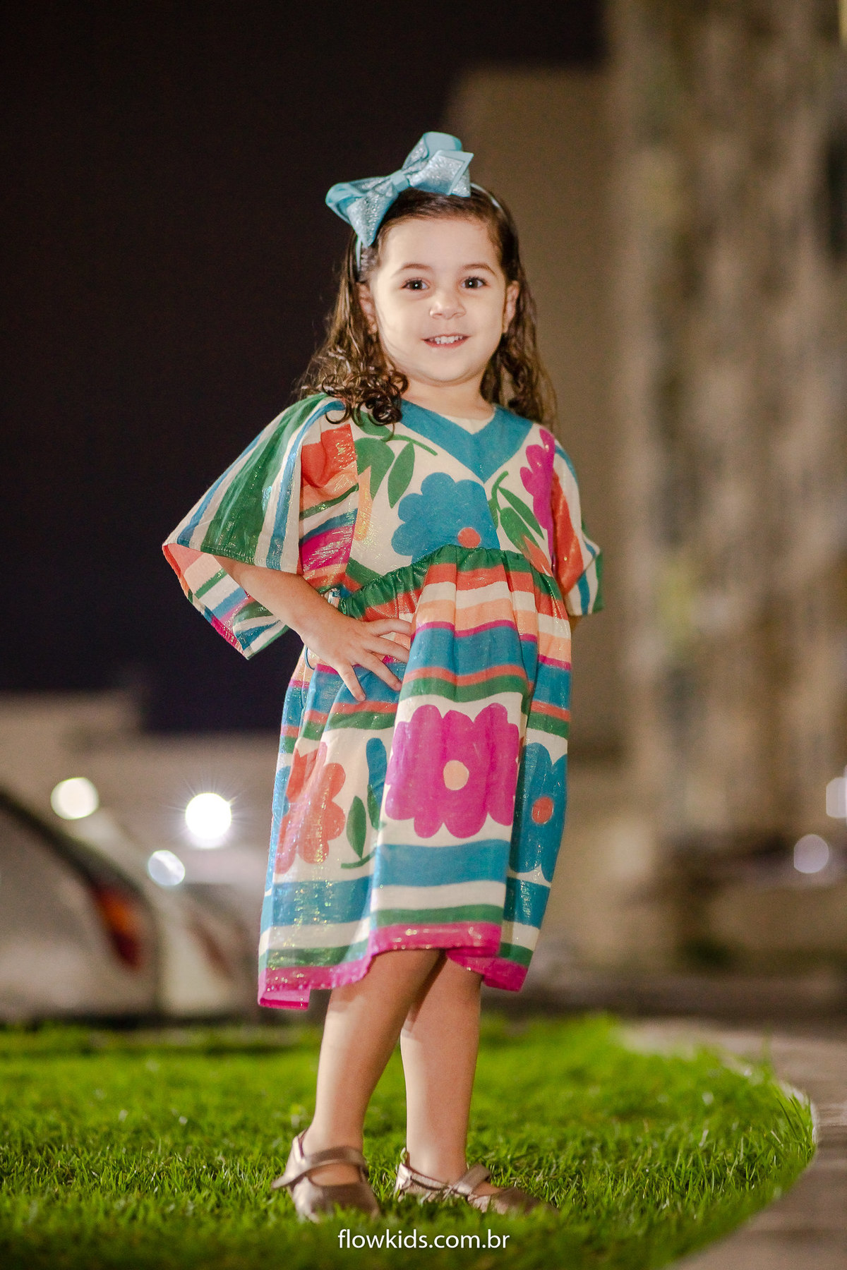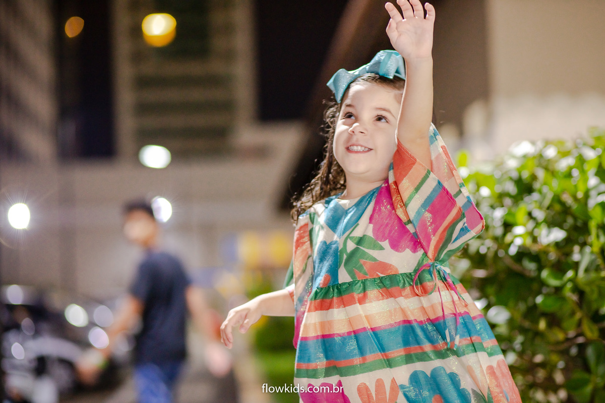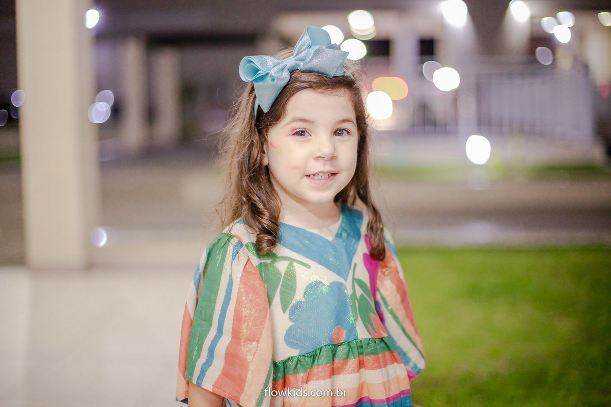 Com seu vestido rodado,laço na cabeça e um lindo sorriso.